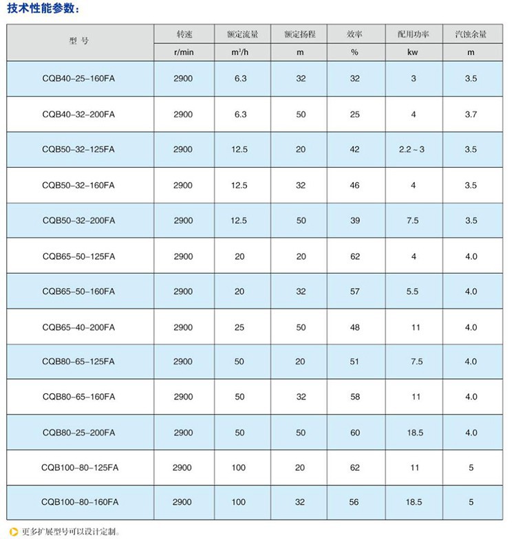 CQB-FA氟塑料磁力泵又称其为氟塑料磁力离心泵、氟塑料磁力驱动泵、耐腐蚀磁力化工泵,CQB-FA衬氟磁力泵是我公司氟塑料磁力泵中的长支架款型。氟塑料磁力泵系列另有:CQB-F经典型、CQB-FJ升级型、IMD后拉式重型。 氟塑料磁力泵主要参数: 流量范围:0.6m3/h-200m3/h 扬程范围:2m-50m 适用介质:任意浓度的酸、碱、盐、有机溶剂等
